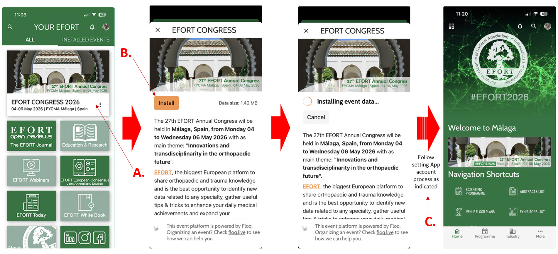 Within the EFORT App click in the congress banner (A.) and download the EFORT Congress 2026 Event App (B.)