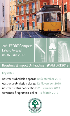 In this resources section, you will find downloadable EFORT artwork for your website to promote our upcoming 20th EFORT Congress that will take place in Lisbon, Portugal from the 05 to the 07 June 2019. We offer you the possibility to choose various types of artwork from horizontal and vertical banners to square mark and signature mark.