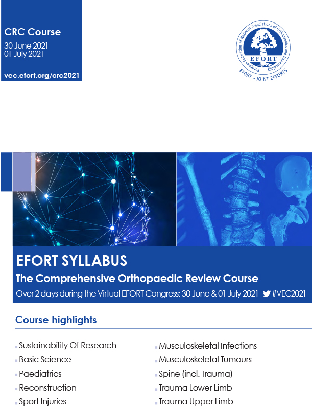 The EFORT Comprehensive Review Course (CRC) provides a quick analysis of the basic and fundamental knowledge of Orthopaedic surgery and Traumatology. The essential information for each topic is presented in a concise and brief way with a high degree of evidence. Experts in each field conduct the course which consists of approximately 20 presentations between 15 – 30 minutes long covering the following major topics: