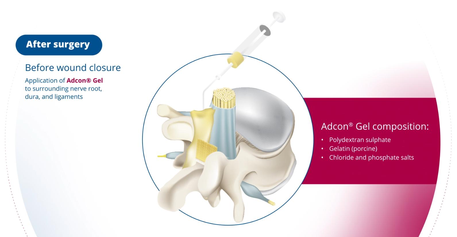 Adcon® Gel is a biocompatible, resorbable gel that provides a physical barrier to intertissue adhesions and inhibits fibroblast migration. This results in improved patient rehabilitation, reduced recurrent pain, and decreased number of re-operations as a result of such adhesions. Prevents adhesion formation: physical barrier to inter-tissue adhesions, adheres to the tissues it is applied onto, and inhibits fibroblast migration on and around neural tendinous structures Resorbable: biocompatible gel that gradually resorbed over a period of 4-6 weeks Adcon® Gel reduces and simplifies re-operations, resulting in lower incidence of Failed Back Surgery Syndrome (FBSS) and eliminates the need to perform differential diagnostics (X-rays, MRIs) Extensive clinical history: used in over 300 thousand cases worldwide and in more than 10 clinical studies since its introduction in 1996 Ease of use: special applicator for easy, yet secure application of the gel to difficult to reach or irregular structures